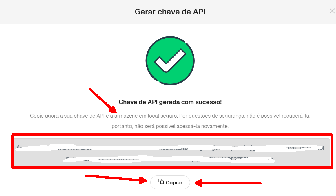 Copie agora a sua chave de API e a armazene em local seguro. Por questões de segurança, não é possível recuperá-la.