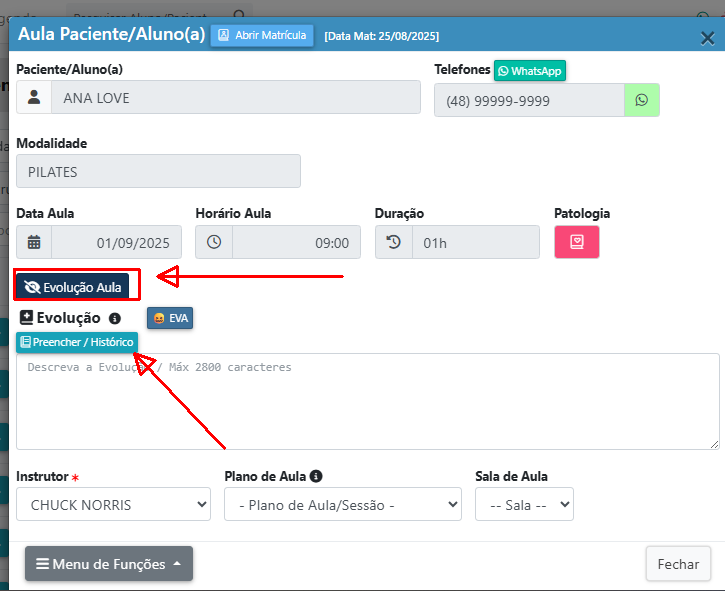 Clique em evolução que vai abrir um campo para descrever a aula diária do aluno, também pode selecionar aparelhos, plano de aula ou exercícios clicando em Preencher/histórico, Histórico pode usar a evolução passada de algum aluno caso seja igual ou queira copiar e colocar alguma coisas da mesma.